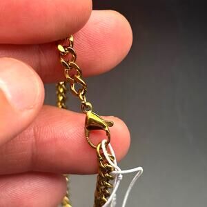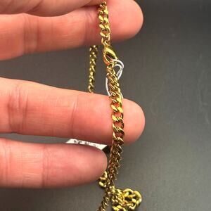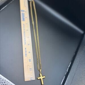 The pendant measures approximately 1.75 inches in length and 1.0 inch in width — a size that balances presence with wearability.  It hangs from a 24-inch gold-plated stainless steel rolo chain, a length that typically sits comfortably at mid-chest on most wearers.