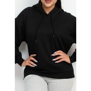 A hoodie and current trend jacket in solid color featuring a loose silhouette, a drawstring, long cuffed sleeves, a drop shoulder, and a hip length.