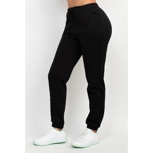 A knit must-have style pair of casual jogger pants in solid color featuring a high-rise waist, elasticized waistband with drawstring, side pockets, and a full cuffed length.