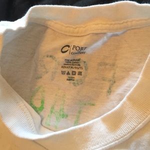 Tshirt from the black light run a few years ago, it is in good condition but it has our team name written in fabric marker on the back of it as pictured. (Bin 1)