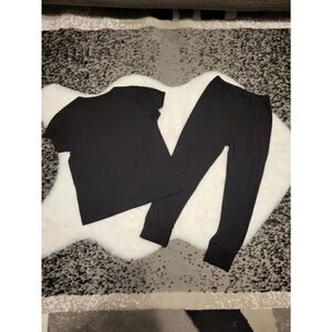 Black matching toddler sleepwear set, size 130/5T, faux buttons, short-sleeved top, long pants, stretch material, warm but not too thick material, excellent condition.