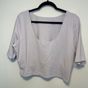 Stretchy scoop neck crop top in a trendy lavender color. Built in shelf bra. No noted flaws. Manufacturer size chart in pix.