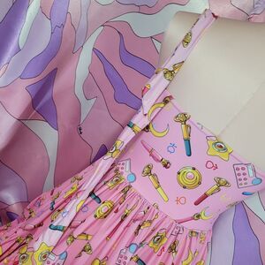 The listing is for the new, no tags size Medium Blackmilk pink sailor moon dress with kawaii compacts and icon print, made of a soft stretchy nylon. There are ties at each shoulder and ruffled skirt.
