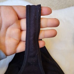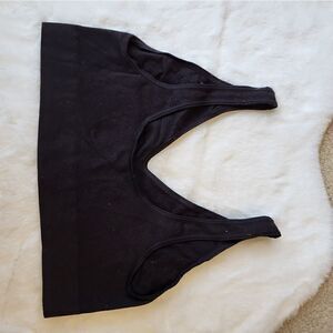 Black no underwire sports bra, size XL, has extra fabric around bust area, has elastic between the cups of the bra for extra support, great used condition