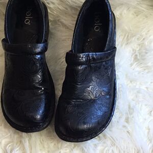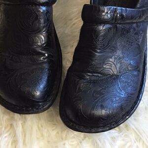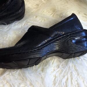 In very good preowned condition Black man made upper in a tooled pattern Size 8