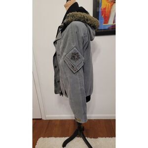 Tags are faded, and size is unable to be seen, please see all photos for measurements. This is a good solid snowboarding coat, with minimal stretch around the waist.