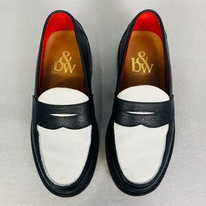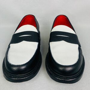 Premium Blackstock & Weber penny loafers in men’s size 7, featuring a bold two-tone black and white leather upper with the brand’s signature red lining. This classic yet modern style pairs effortlessly with preppy, business casual, and classicore trends. Perfect for workwear, events, concerts, or adding timeless polish to a streetwear fit.