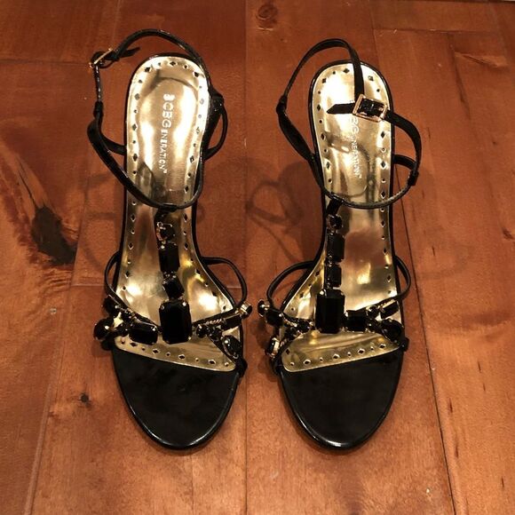 Never worn, black stones on straps , adjustable strap gold heels and hardware. NWOB
