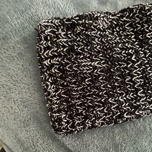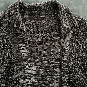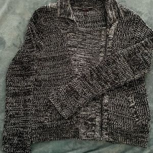 Black and white knit cardigan has an asymmetrical zipper. Zips the entire length which measures 24 inches from shoulder to hem. Measures 18 inches from pit to pit. It also has two pockets. The arms measure 25 inches. 2front pockets. Very versatile sweater with open collar.