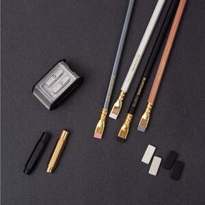 4 Blackwing pencils with a range of Soft, Balanced, Firm and Extra-firm graphite, 2 Point Guards that keep your pencil from breaking on the go, 1 Black Long Point Sharpener that uses a two-step process to first sharpen the wood before precision sharpening