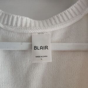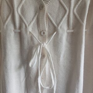Chic cream cardigan with diamond knit design. Features a tie front and button details. Ideal for layering.