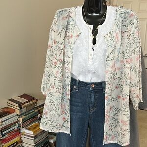Elegant floral print top by Blair. Features a beautiful mix of white, pink, and green colors.
