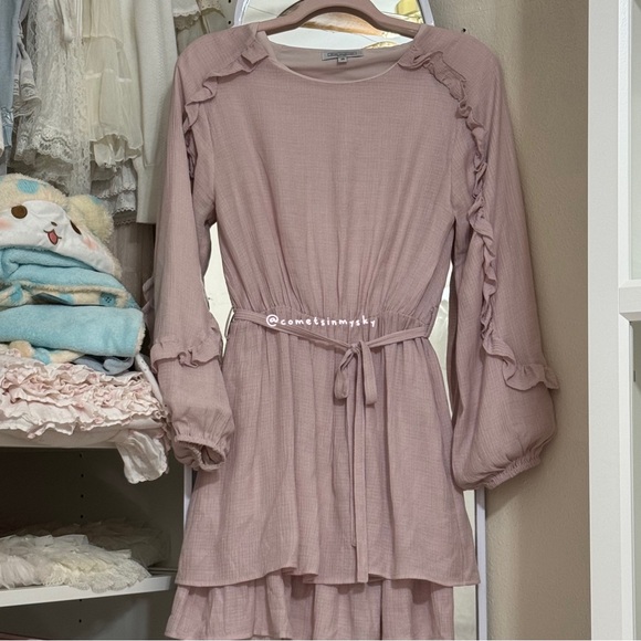 This elegant mauve blouse features delicate ruffles and a flattering tie waist. Perfect for any occasion.