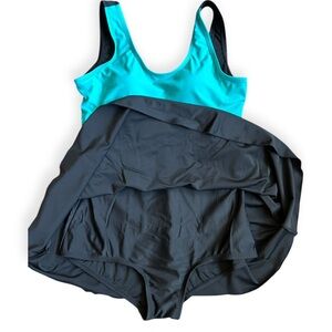 Stylish one-piece swimsuit by Blair. Features aqua top with black skirt. Comfortable and chic design. Geometric blue/aqua design on top. Dress babydoll design one piece swimsuit. Built in bra. In excellent condition.