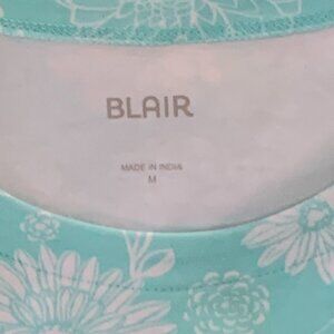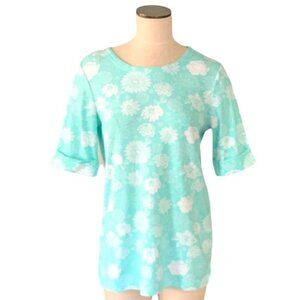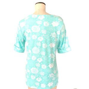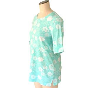 Blair Short Cuffed Sleeve Tee Top Side Slit Sz M Floral Blue-Green & White #213E