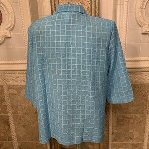 Blair. Size 3X. Please note that the tag says it's an XL. However the bust measures 52" which is a 3X. Possibly this didn't sell because it was miss sized. 3/4 Sleeve. Textured Flowy Shirt. Pearlized Buttons. Center back 29.5". 3/4 sleeve 18.7". Side slits. Shoulder pads. Poly. Very good pre-loved condition.