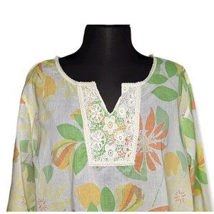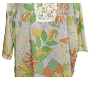 EUC like new tunic in a tropical print with a crochet accent. This would be cute as a swim cover up as well. See pictures for measurements.