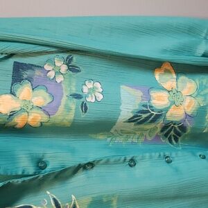 Button-front collared blouse with screen print floral design on each side, PtoP 22", 25" long