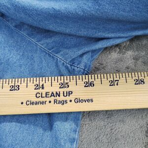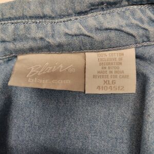The Blair Women Size XL Embroidered Angel Denim Button Down Shirt Top is a stylish addition to any wardrobe, perfect for casual occasions in the fall or spring seasons. Made from 100% cotton denim, this shirt features a collared neckline, button closure, and long sleeves. The embroidered angel patch adds a unique touch to the solid blue color, making it a standout piece with themes of cottagecore, Grannycore, and angelcore. Machine washable for easy care, this top is a timeless classic with a 90s vibe.