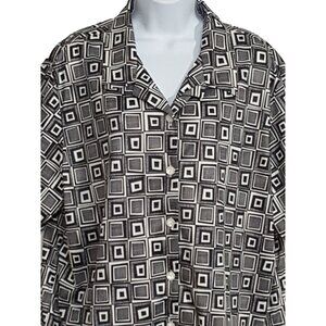 Classic black and white geometric patterned blouse by Blair. A button-up piece with a collar, vintage style with a modern twist. Made from polyester, size 2XL. Short sleeve design perfect for any occasion.