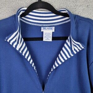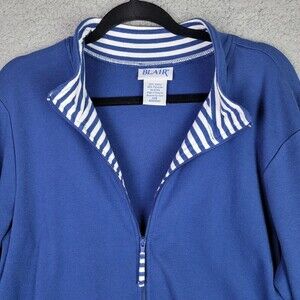Blair Women's Jacket Size Large Blue Full Zip with complementary zipper pull Pockets White Stripe Contrast on the collar and cuffs