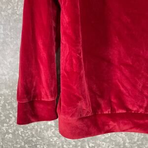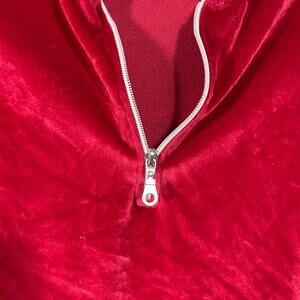 Women's retro style velour sweatshirt by Blair. This red pullover sweater has a quarter zip at the neck, long sleeves, and a retro 80's style. It is 100% polyester.