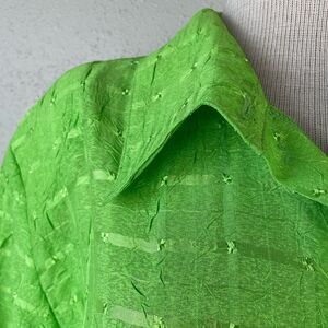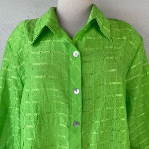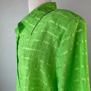 Love the bright green color and design on this button down shirt by Blair. It measures 23 inches armpit to armpit laying flat and 30 inches in length from shoulder to hem.
