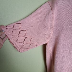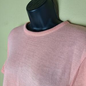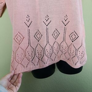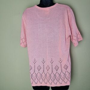 This is a short sleeve peach colored sweater by Blair. It has laser cut geometric detailing.