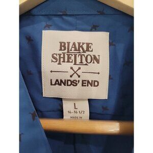 The Blake Shelton x Lands' End Shirt in Mens Size L features a blue bird print on a long sleeve button-up design. Made of a blend of polyester, nylon, and cotton, this shirt is suitable for travel, casual wear, and workwear occasions. With a regular fit and a button-down collar, it offers a Western and cowboy theme, perfect for those who appreciate a unique and stylish addition to their wardrobe. Made in Bangladesh, this shirt is a comfortable and versatile choice for men looking for a standout piece in their collection.
