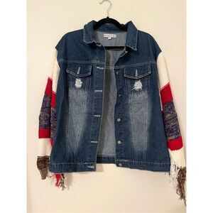 This all-American Fringe Jean Jacket gives a classic look a modern update. This distress denim jacket features knitted arms with fringe that add timeless texture and style.