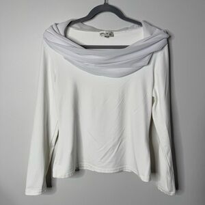 Blanc Nature White Sheer Contrast Cowl Neck Off Shoulder Stretch Long Sleeve Top