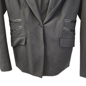 Adorable heavier weight one button blazer jacket that is hooded with drawstrings at the hood and vegan leather accents both on the front and back. Front top closure pockets.