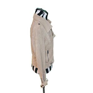 Faux suede biker jacket style. Super comfortable. Looks fantastic with jeans or dressed up for the evening