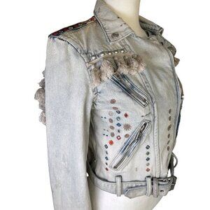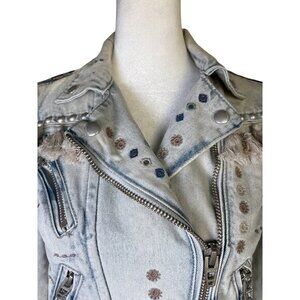BlancNYC Size XS Denim Jean Jacket Boho Moto Embellished Embroidered Mirrors Tas