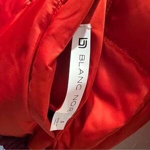 Short reversible puffer jacket with nylon on one side and knit on the reverse with a hidden hood in the collar