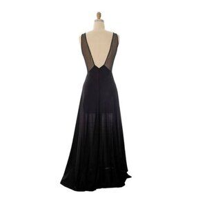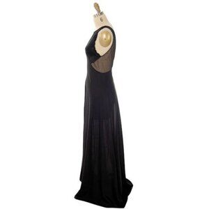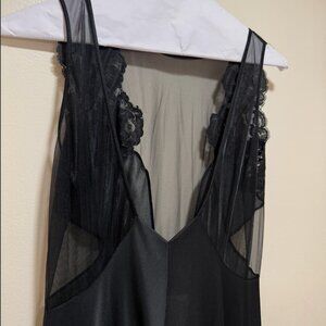 Black nylon full-length vintage nightie with a sheer plunging neckline and trimmed with lingerie lace