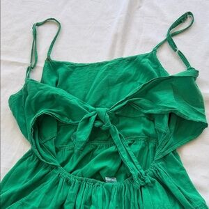 Chic green spaghetti strap dress. Perfect for summer outings. Cute open back and adjustable straps