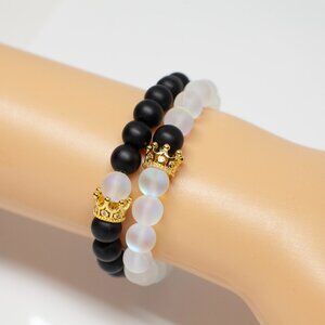 Stylish and meaningful, this bracelet duo is perfect for couples, best friends, or anyone who loves symbolic jewelry. Each bracelet features smooth matte black and frosted white beads with a gold-tone crown accent, representing a king and queen or yin and yang balance.