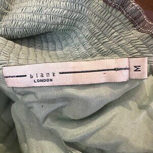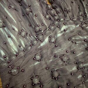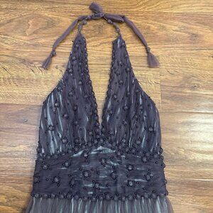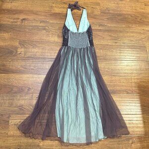 Aqua color with tulle overlay, v neck, halter tied neck, beaded front, midi length, Smocked elastic stretch back