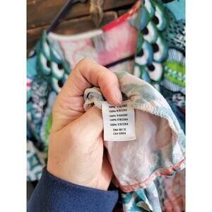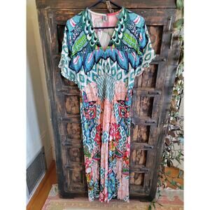 Gorgeous floral print caftan style dress w an elasticized front gather for the perfect fit. Super flattering and perfect for vacation.