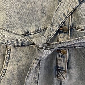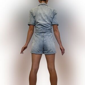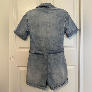 Blank NYC light wash denim button front belted romper. Size XS. 2 flap pockets on chest and side pockets at waist. 7 logo button closure in front with matching denim tie belt. Folded cuffs at legs and arms. Very good preowned condition.