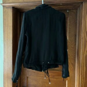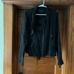 This Blank NYC jacket in a rich black color showcases a chic waterfall front, blending modern style with timeless elegance. Made from premium leather, it offers a sleek and sophisticated look suitable for various occasions. The full-length sleeves enhance its versatile appeal, making it a must-have addition to your wardrobe.