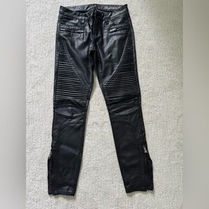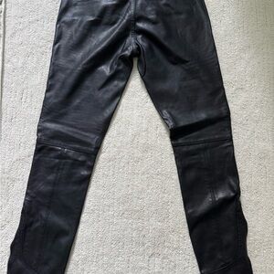 Sleek black moto faux leather pants. Features zipper details. Stylish and edgy design.