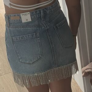 Trendy denim mini skirt with beaded fringe. Ideal for casual wear. Classic blue hue.