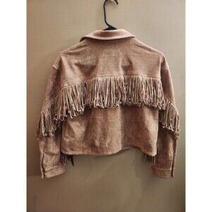 Stylish suede jacket with fringe details. Button-up front. Perfect for casual outings.