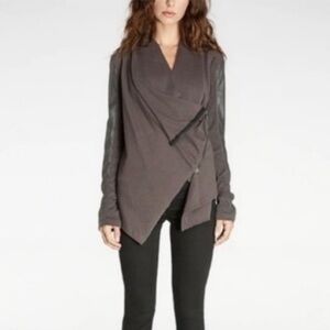 Asymmetrical zip front with draped collar Mixed fabrics of vegan faux leather and faux suede