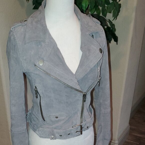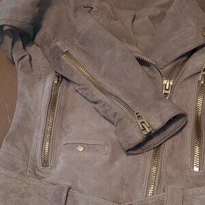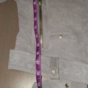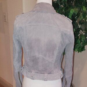 Suede moto jacket with notched collar, belt, and silver hardware. Two front zip pockets and one change pocket, arm zips, and shoulder epaulettes. Gorgeous blue-gray color. Excellent condition. I never wore it because I wear a small and it is true XS sizing, so please see the measurements.