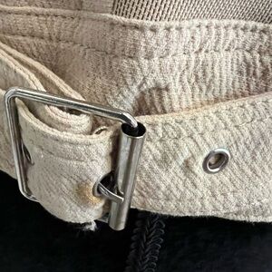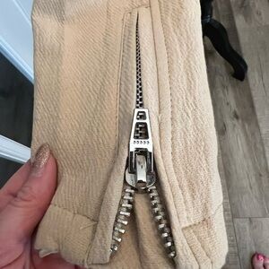 This Blank NYC cream moto jacket features a chic asymmetrical zipper and a notched lapel collar, offering a modern twist on the classic moto style. Its fitted silhouette and structured shoulders create a sophisticated look. Zippers on cuffs studs and buckle on sides with mesh panel. 100% cotton shell, fully lined - Really nice jacket. Size M EUC (small stain by buckle on one side by buckle see photo)