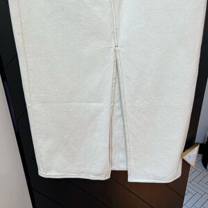 Stylish cream denim maxi skirt with front slit. Perfect for casual outings.