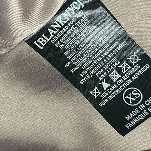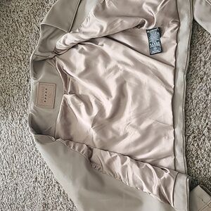 This Blank NYC cream leather jacket features an asymmetrical front zipper and a sleek, collarless design. Its cropped length and minimalistic style make it a versatile addition to any wardrobe, perfect for both casual and dressier occasions.